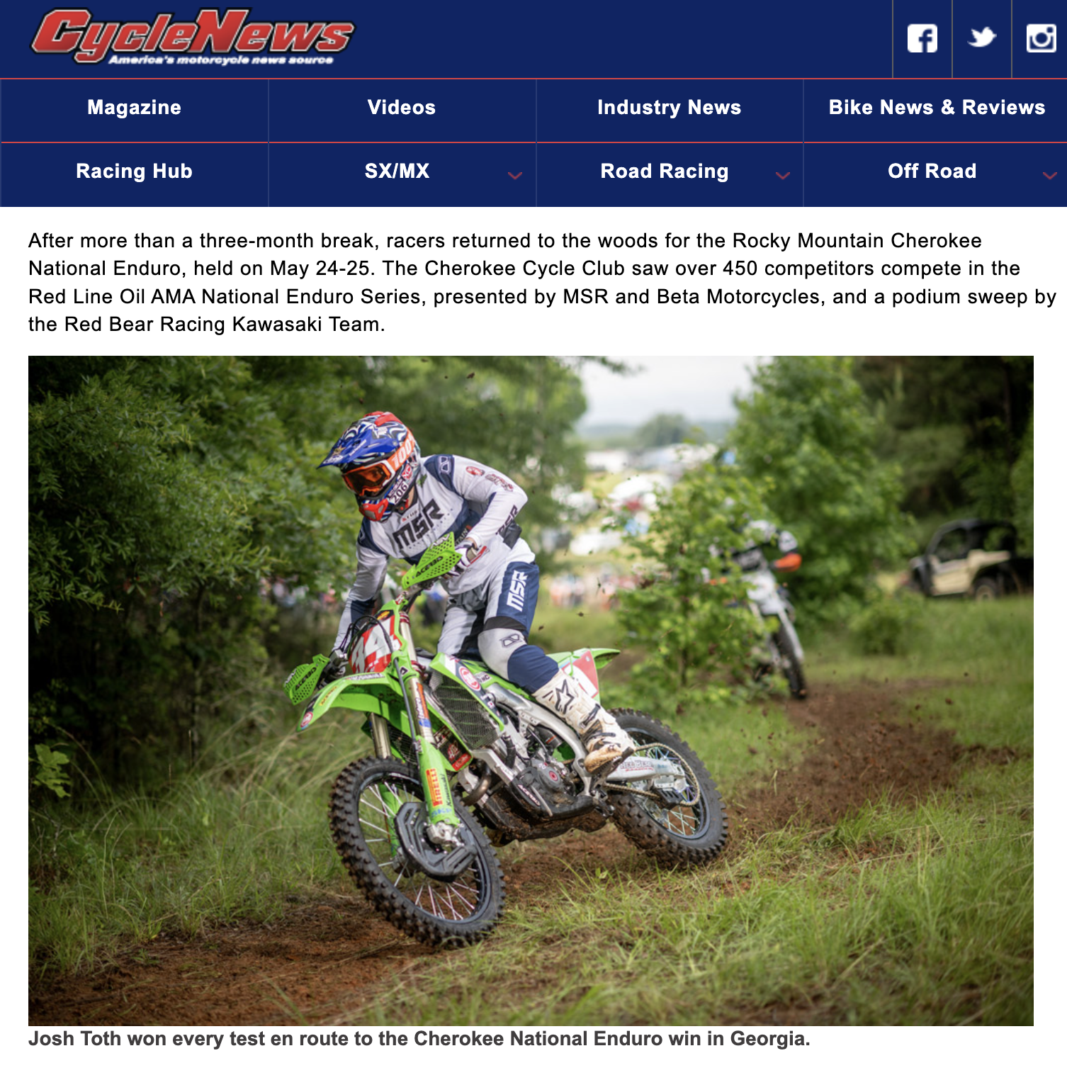 After more than a three-month break, racers returned to the woods for the Rocky Mountain Cherokee National Enduro, held on May 24-25. The Cherokee Cycle Club saw over 450 competitors compete in the Red Line Oil AMA National Enduro Series, presented by MSR and Beta Motorcycles, and a podium sweep by the Red Bear Racing Kawasaki Team.